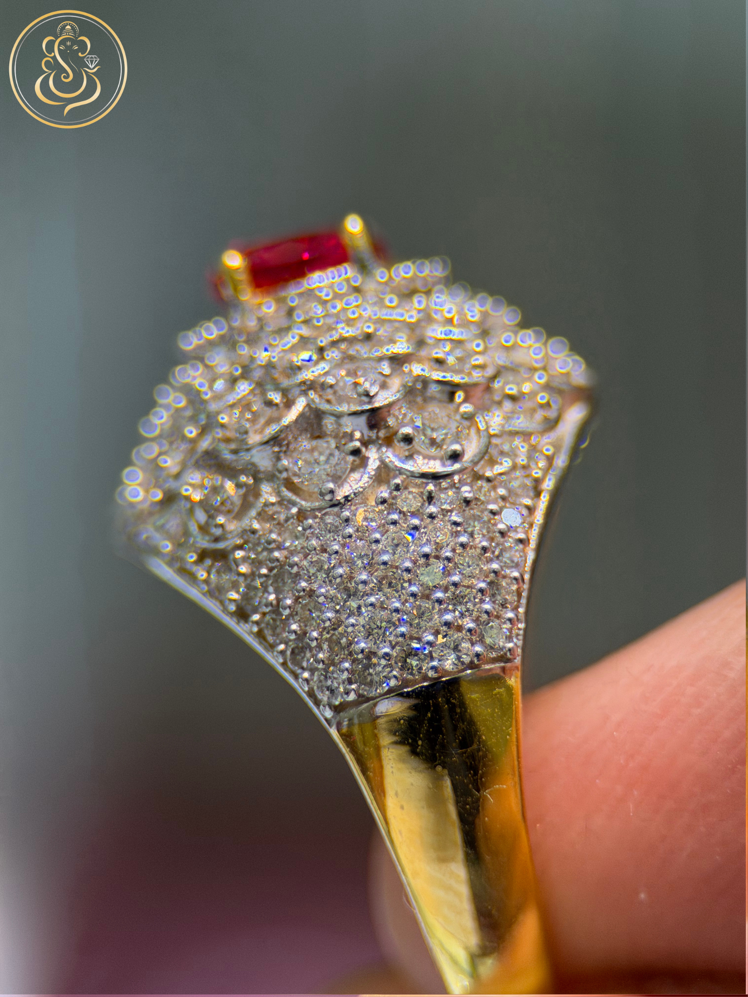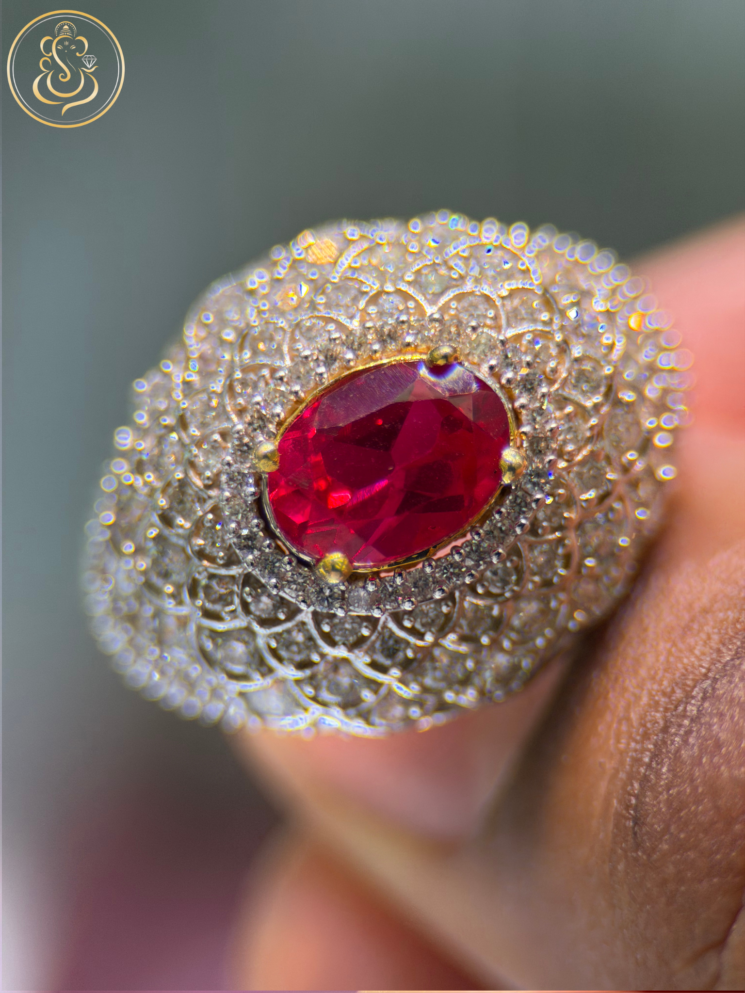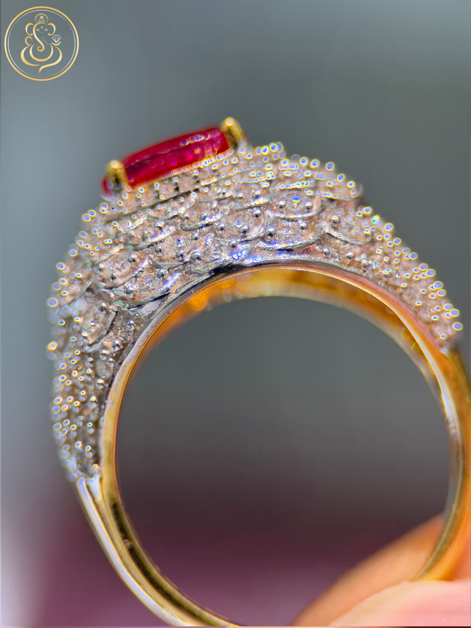Set in rich 18KT yellow gold with a total gold weight of 10.44 grams, this ring showcases a timeless design that highlights the vibrant red centerpiece while enhancing sparkle through its diamond accents. Perfect for special occasions, statement wear, or elegant gifting.